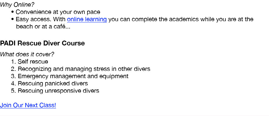 If you are considering the PADI Rescue Diver course, you have passed a significant milestone in your dive training. Regardless of what your long-term motivations might be, you have passed through the "egocentric gate" of being concerned soley about yourself when you dive. You have begun to think outward and of the well being of those with whom you dive. You have become a very valuable buddy for your friends, family and other casual diver colleagues! The objective of the Rescue Diver course is teach students (1) to manage more complex diving emergencies and (2) the application of direct intervention techniques to assist others in an emergency. The Rescue Diver courses is mandatory for all higher level PADI leadership certifications. This is a serious course in many ways. However, we strive to make it an enjoyable challenge that will build your confidence as you progress with your training.